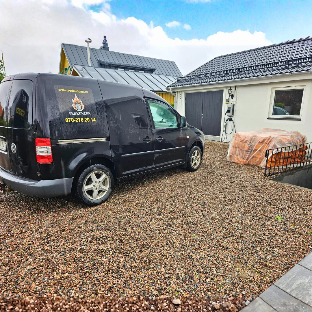Med vår lilla, smidiga bil tar vi oss fram på de flesta vägar. Veden levereras precis där du vill ha den.