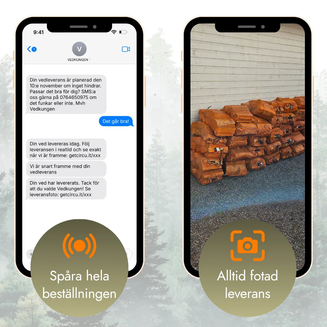 Du behöver inte vara hemma. Följ leveransen live och se exakt när föraren är framme. Vi tar alltid bild när veden är levererad, och du kan ringa föraren direkt om du vill ge särskilda instruktioner.