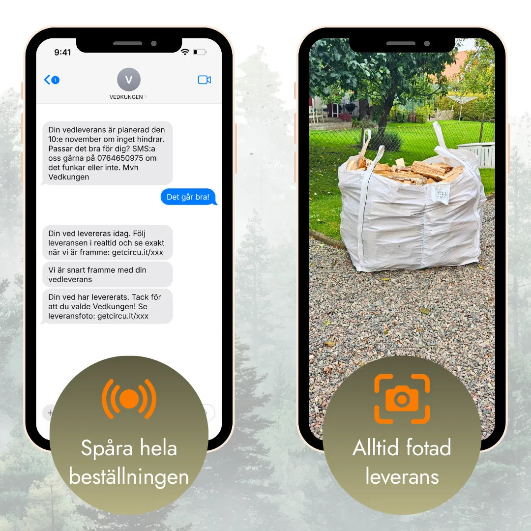 Du behöver inte vara hemma. Följ leveransen live och se exakt när föraren är framme. Vi tar alltid bild när veden är levererad, och du kan ringa föraren direkt om du vill ge särskilda instruktioner.